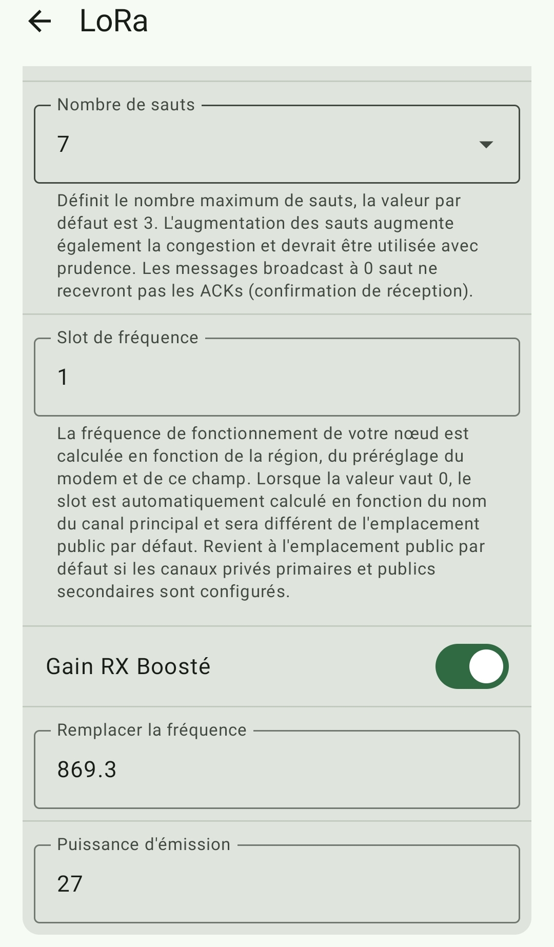 - Changer la configuration LORA par déafut qui est LONG FAST pour la régler sur PORTEE MOYENNE, RAPIDE